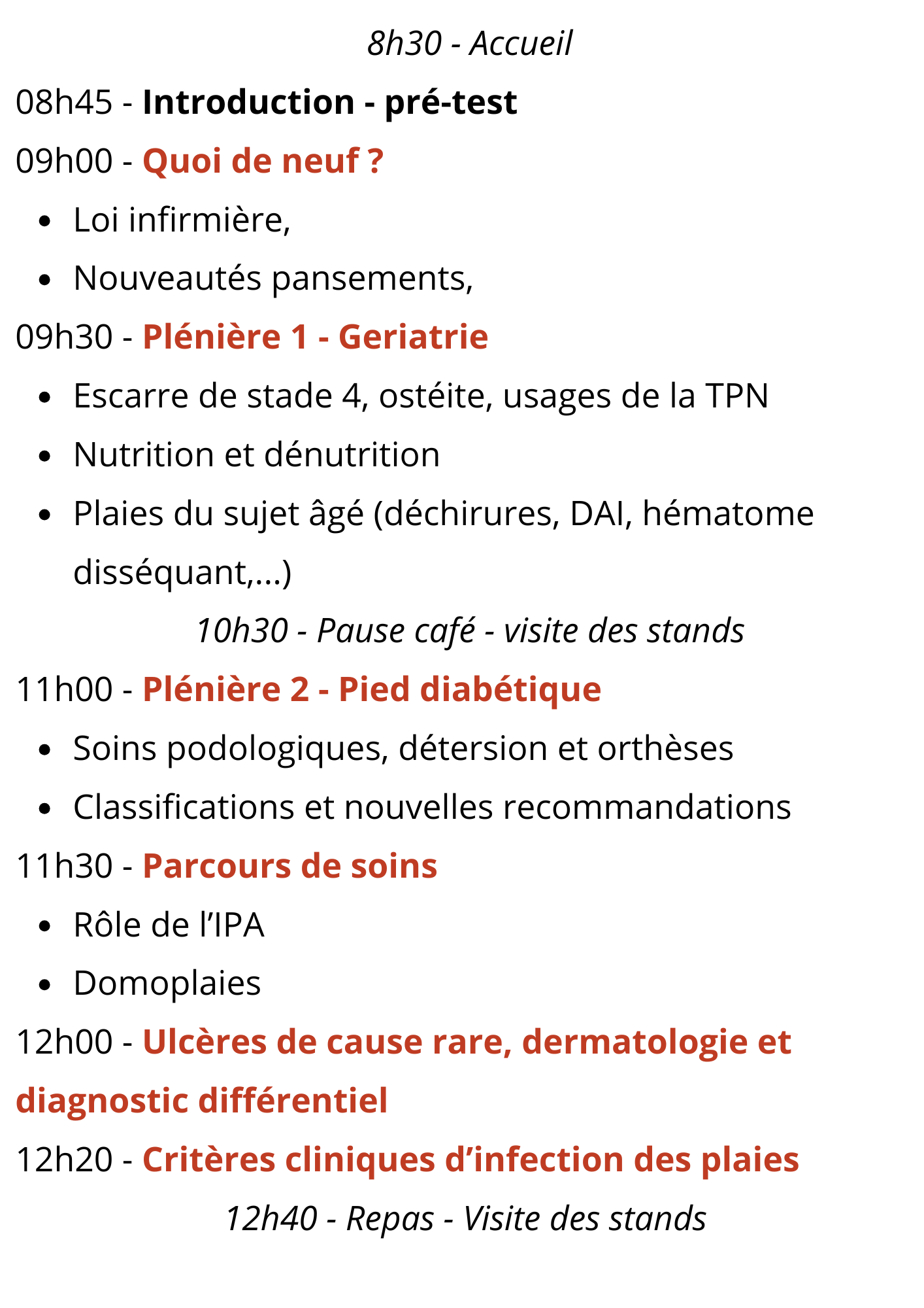 Seront abordées différentes thématiques autour de sessions plénières et d‘ateliers afin de promouvoir les bonnes pratiques en plaies et cicatrisation, et actualiser nos connaissances sur les nouveaux modes de prise en charge par téléconsultation, télé expertise, télésurveillance, E- parcours.